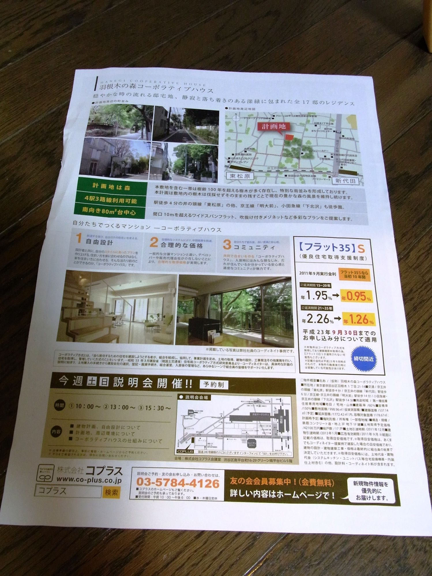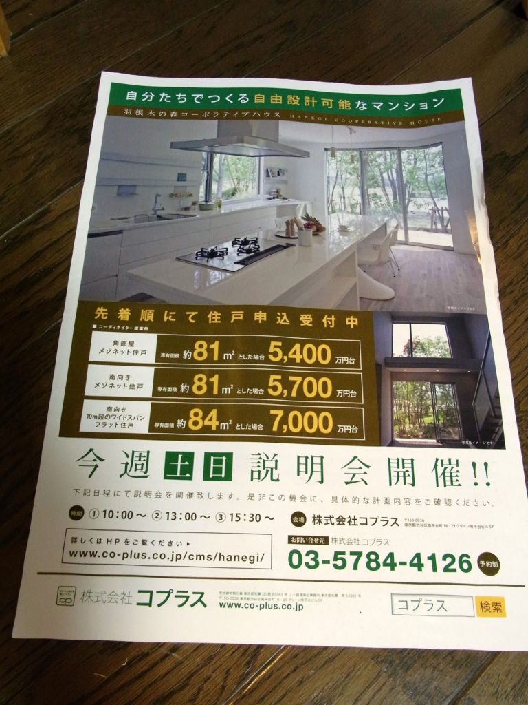 以前このブログで紹介させていただいた、コプラスの新しいコーポラティブハウス、「羽根木の森コーポラティブハウス」ですが、またしても我が家の新聞広告に入っていました。