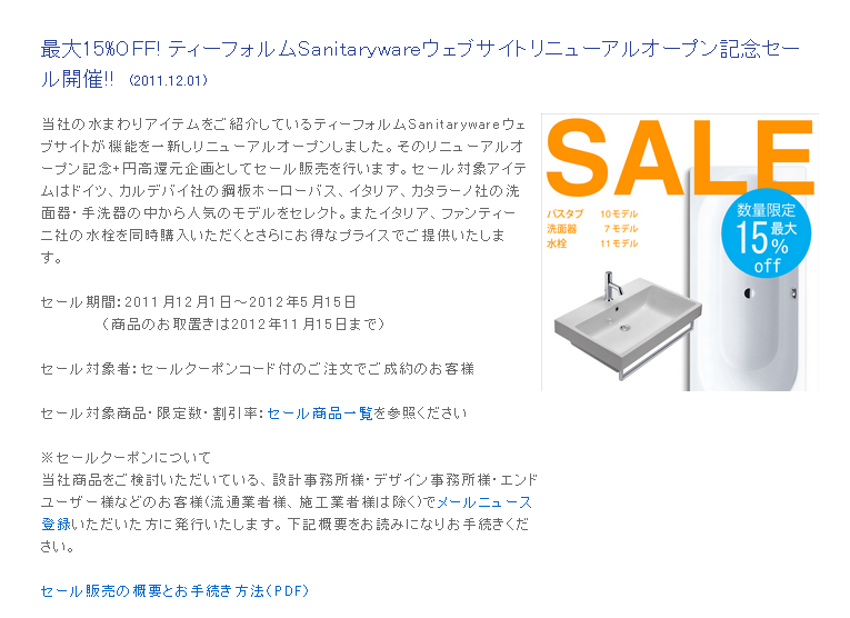 ■最大15%OFF! ティーフォルムSanitarywareウェブサイトリニューアルオープン記念セール開催!!