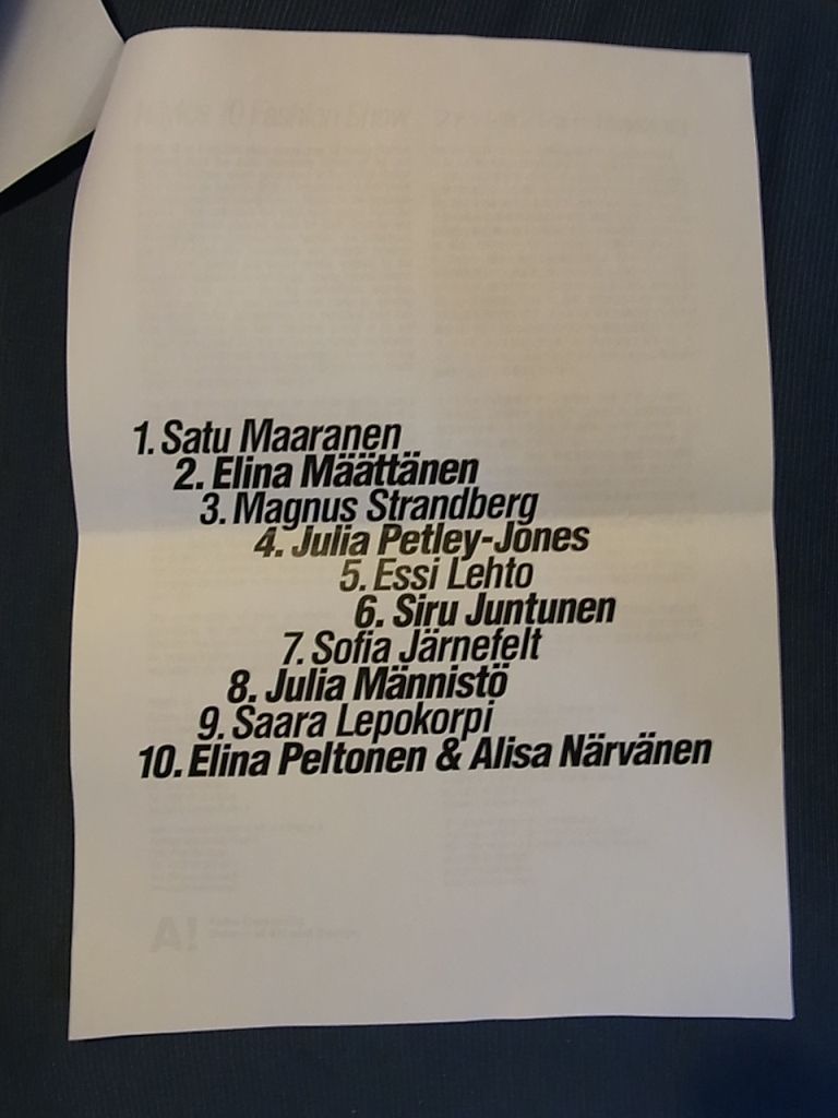 フィンランドのアールト大学の芸術デザイン大学を代表する10人の若いフィンランド人デザイナーによるファッションショーでした。