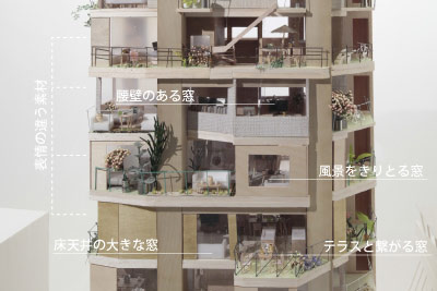 各フロア均一ではなく、フロアによってテラスが出ていたり引っ込んでいたりとアシンメトリーな構造になっていて非常にユニークです。