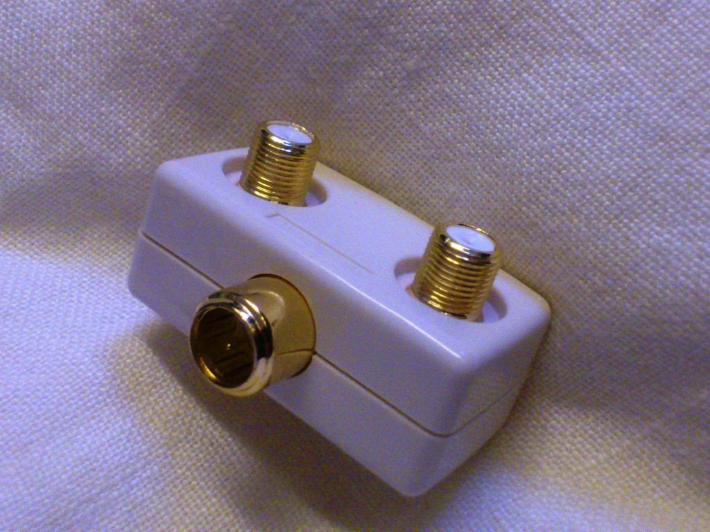 左下の穴を壁のテレビ端子に接続し、2つ出ているやつを1つはテレビに、もう1つをFMチューナーに接続します。