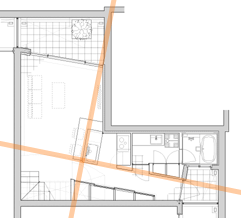 言葉で説明は難しいですが、実際の壁を少しずらしたヴァーチャルな壁を作ることで奥行きを持たせています。そのバーチャルな壁に沿ってキッチンやクローゼットを配置しています。