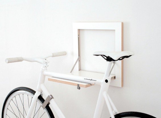 SLITは下の写真のように、壁から90度に突き出た板の上にフレームを載せるタイプ。自転車を載せない時は畳むことができて場所を取りません。