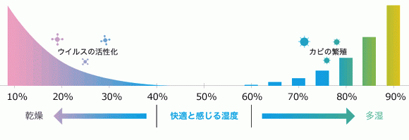 ヤマギワさんのメールマガジンに下記のような図が載っていました。湿度40%~60%が適度な湿度ということです。湿度が低いとインフルエンザウイルスなどのウイルスが活性化するそうです。