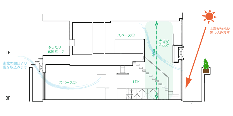 1FとBFをつなぐ吹抜け空間の天井高は5.6mということでこれは迫力があると思います。
